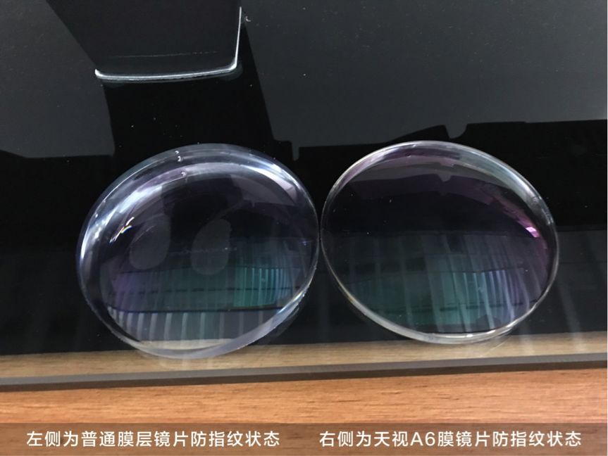虽然在镜片上留下指纹不会被警察蜀黍抓起来,但镜片上的指纹会影响我们的视觉清晰度,在防指纹测试中,我们用手指分别摁在镀有天视A6膜与普通膜的镜片表面,小编通过观察A6膜镜片上没有明显的指纹印记,而普通的,呵呵,自己看吧。