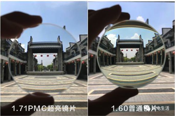 小编快马加鞭的就拿出这两款1.71PMC超亮镜片和1.60镜片作为对比, 在同一角度透过镜片观看物体,左图为1.71PMC超亮镜片,右图为1.60镜片。