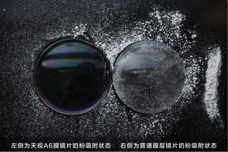 在接下来的防尘实验中,小编在天视A6膜镜片、普通膜镜片两款镜片上分别洒落一小把奶粉,进行防尘测试。用手轻轻抖动粘上奶粉的镜片,普通膜层的镜片粘连了不少奶粉在上面,而天视A6膜镜片上的奶粉基本被抖落。