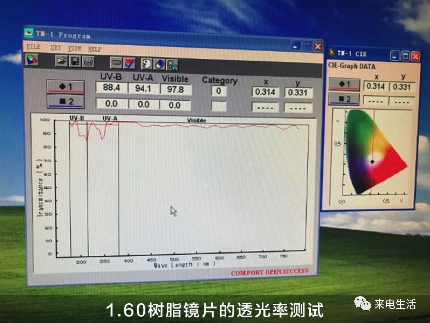 1.60树脂镜片的透光率(图中Visible栏)为97.8%。