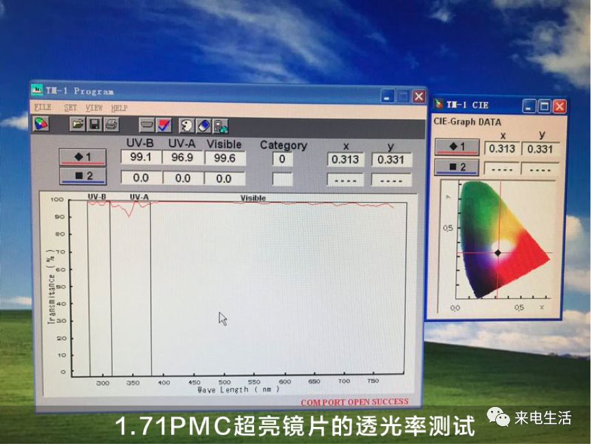 在同等条件下,明月镜片1.71PMC超亮镜片(71KP)的透光率(图中Visible栏)为99.6%。
