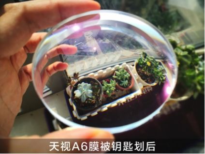 对此,我们对镀有天视A6膜的1.71PMC超亮镜片与普通膜层镜片进行了“暴力测试“——使用坚硬的钥匙往复划镜片表面。