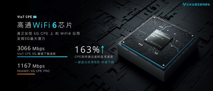 2019年10月21日,云米携手高端AI科技家电品牌coKiing,在北京举办主题为“用AI科技,探索无限未来”发布会。会上发布了VIoT 5G CPE(Customer Premise Equipment,客户终端设备),是全球第一款混合网络5G CPE,专为家庭IoT连接而生,可以实现5G信号全屋场景全覆盖,更重要的是,VIoT 5G CPE下行速率理论值高达3.4Gbps,支持256+设备同时接入,真正实现全屋家电互联互通,让全场景智慧生活体验触手可及。