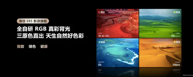 海信E8S的核心优势,源于RGB-Mini LED技术的代际突破,对QD-Mini LED、SQD-Mini LED等单色背光量子点Mini LED技术形成全方位体验碾压,其用户价值集中体现在画质、能耗、健康三大核心维度。