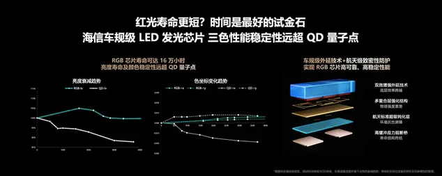 用户日常使用中,采用RGB真彩背光的海信E8S更是带来双重增益:一是节能40%以上,长期使用可显著降低电费支出,更契合绿色家居需求;二是硬件级减少42%有害蓝光,实现护眼不偏色,老人、儿童长时间观看也更安心。稳定性方面,搭载乾照光电全自研车规级发光芯片,经85℃高温、60mA大电流极限测试,红光芯片寿命突破16万小时,超十年不褪色,耐用性远超易老化的量子点方案。